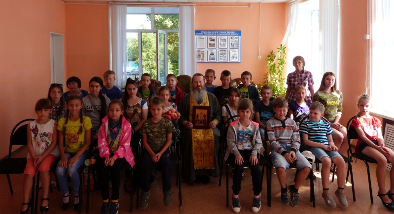 На неделе празднования Преображения Господня, детский оздоровительный лагерь при КЦСОН  Пугачевского района посетили священник храма Воскресения Христова г. Пугачева иерей Сергий Анохин с помощником благочинного по религиозному образованию и катехизации Светланой Моисейцевой.
