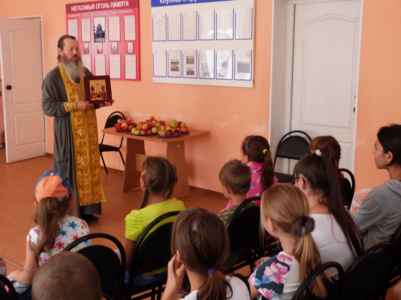 Отец Сергий рассказал ребятам о празднике урожая, во время которого верующие приносят в церковь освятить яблоки, груши, сливы, виноград. Это один из двенадцати крупнейших церковных праздников — день Преображения Господня.